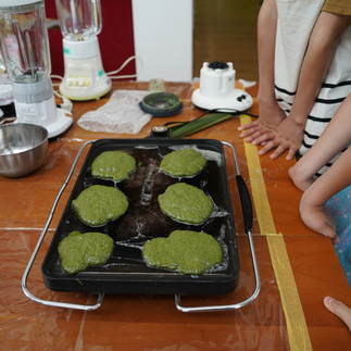 このヨモギは4月のオリエンテーションの時に、敷地内で摘んだものを冷凍しておきました。小麦粉・牛乳・卵・ベーキングパウダー・重曹・島ザラメをミキサーで混ぜて