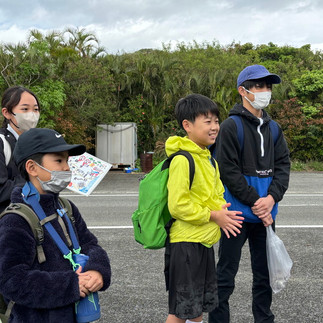 地図を見ながら歩く子供たち。左側に喜界島見えているね。どの方向に歩くのかな?